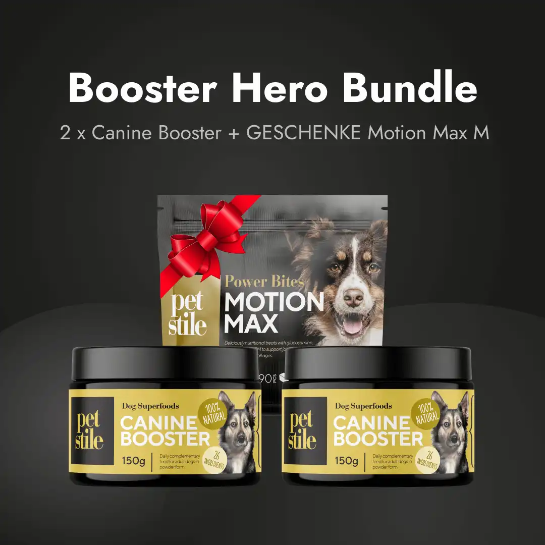 Diese leistungsstarke Kombination bietet umfassende Unterstützung für die Gesundheit Ihres Hundes. Der Canine Booster sorgt für eine konstante tägliche Nahrungsergänzung, während die Motion Max Power Bites als leckere Snacks gezielte Gelenkpflege bieten, die Ihr Hund lieben wird!