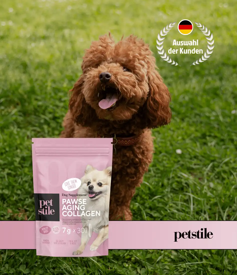 Pawse Aging Collagen kombiniert hochwertige Rinderkollagen, Fischkollagen und Eierschalenmembran mit essentiellen Vitaminen und Antioxidantien, um sichtbare Alterszeichen von innen heraus zu bekämpfen. Während andere Produkte nur Symptome behandeln, wirkt die Petstile-Formel an der Wurzel des Alterns und stärkt das Immunsystem über die Darmgesundheit. Sie hilft Ihrem Hund, Vitalität, Energie und jugendliches Aussehen zurückzugewinnen – auf natürliche Weise.